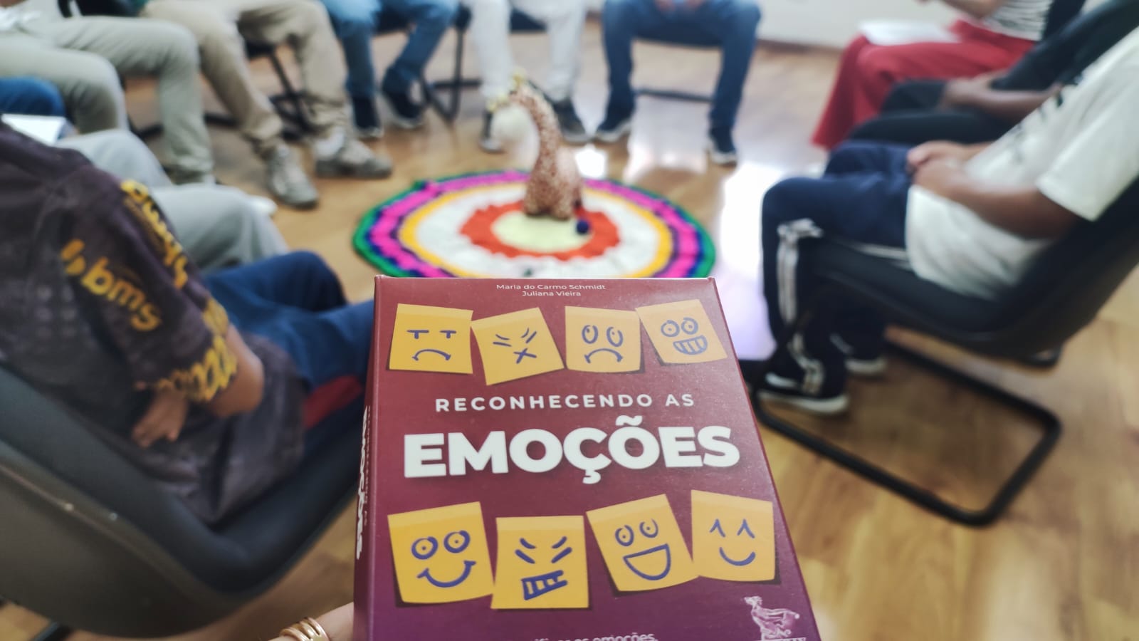 Como parte da dinâmica de integração, os próprios jovens construíram a peça de centro do círculo. Foram eles que escolheram o tapete e os elementos que representavam sentimentos e experiências pessoais. A atividade favoreceu o envolvimento do grupo.